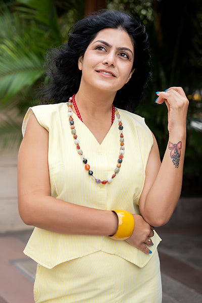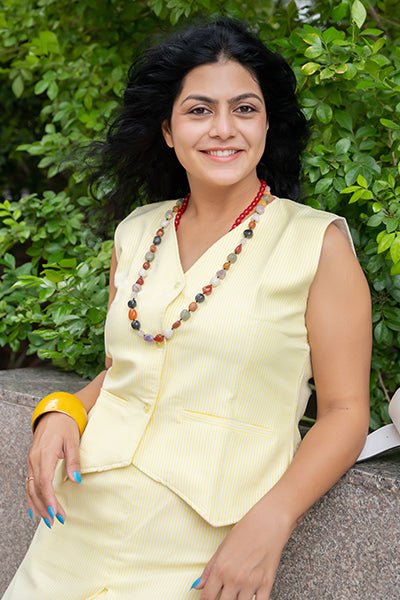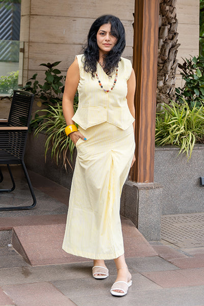 Radiate effortless charm in our Sunny Striped Co-ord Set, crafted from 100% breathable cotton. Featuring a sleeveless top with soft pleats and a flowy matching skirt, this set offers relaxed elegance with a touch of summer brightness—perfect for brunches, vacations, or easy everyday styling. Its tailored silhouette also makes it a classy choice for a polished corporate look.