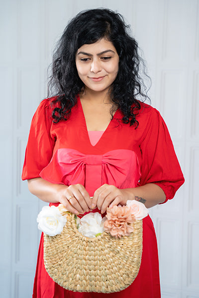 Fierce meets feminine in the Hot-Knot Dress — a bold red mini crafted from soft, breathable rayon fabric. Featuring dramatic puff sleeves, a deep V-neckline, and a statement hot pink bow, this look is designed to turn heads.