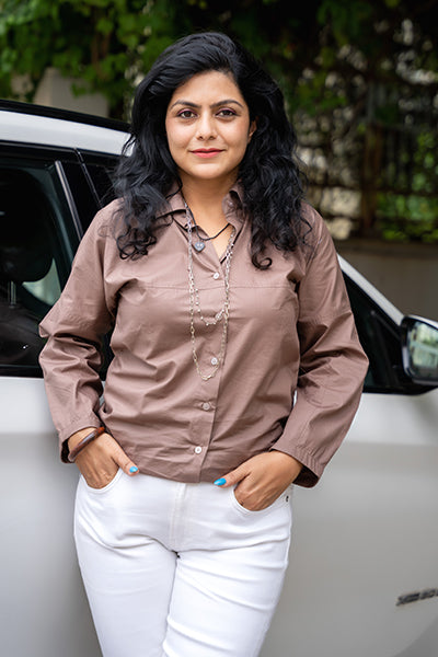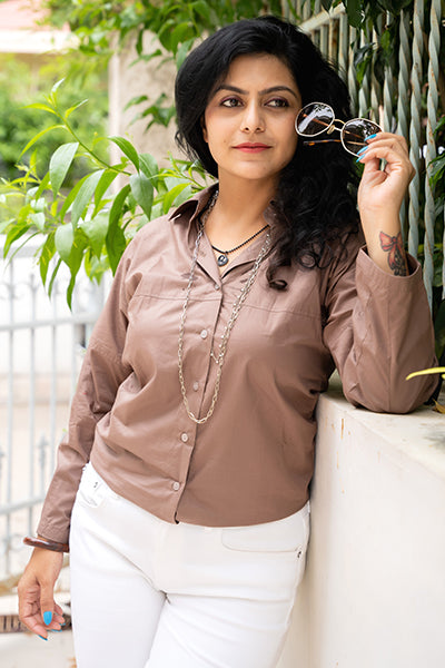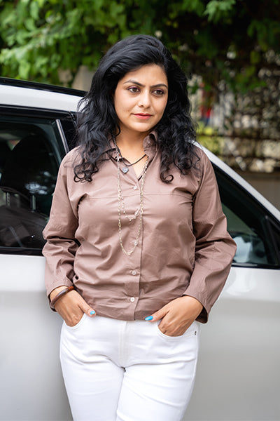 Crafted from 100% cotton poplin, this everyday essential balances clean lines with effortless charm. The muted brown hue and minimal design make it a versatile pick — polished enough for work, relaxed enough for the weekend. A timeless staple for those who believe less is truly more.