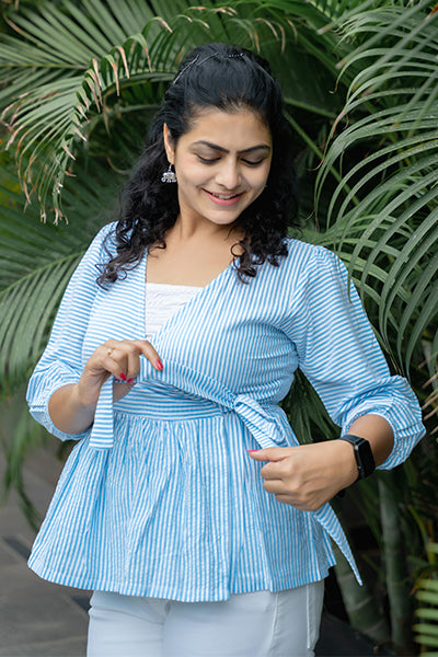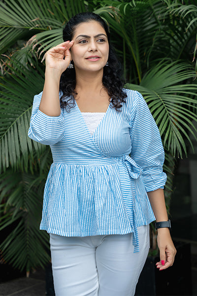 Breathe easy in the Skyline Angarkha Top — made from 100% cotton for all-day comfort. With soft blue stripes and a wrap-style silhouette, this modern take on a classic angarkha is perfect for both workdays and weekends.