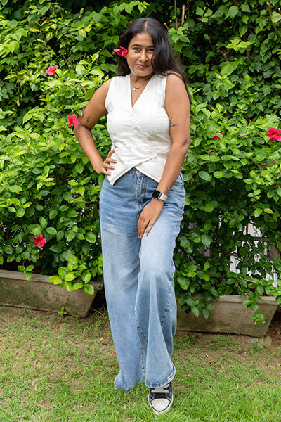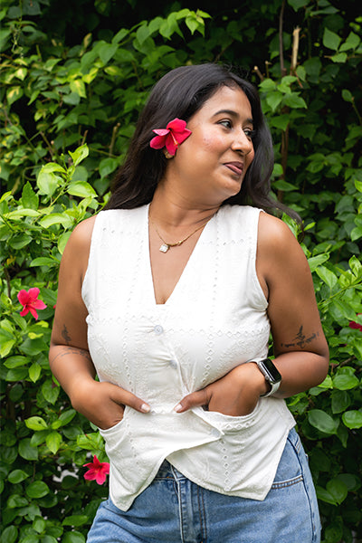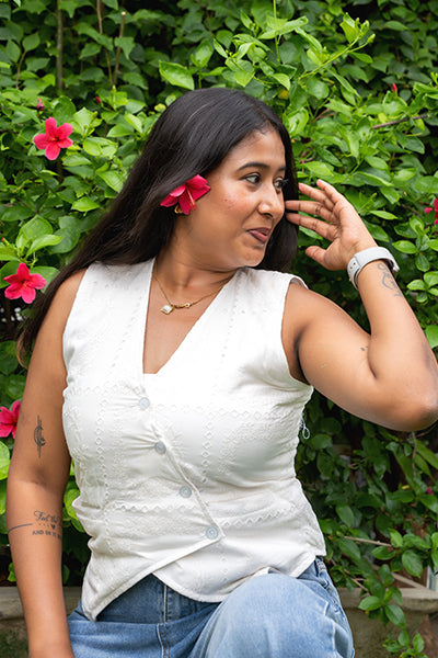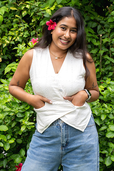A soft layering piece that blends structure with subtle femininity. Made from 100% breathable cotton with delicate embroidery, this sleeveless waistcoat-style top is designed to flatter with ease. Buttoned down the front with gentle tapering at the waist — it’s perfect for warm days when comfort meets charm.